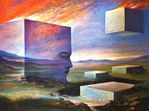 A Lángolók című, nem túl méretes, 50×60-olajfestményben benne van Szurcsik József művészi világának lényege, (az is lehet, hogy maga a világ), annak kvintesszenciája, ahogy azt már mondani szokás, s mint ilyet, leírni igen nehéz azt. Merthogy szavakkal láttatni egy másfajta művészet. Nem azt nehéz leírni, amit a képen látunk, a kettős osztatú képen, melyet kockák uralnak, jobboldalt három földbe süllyesztett és egy égbe emelkedő lángoló kocka, baloldalt egy hatalmas, átlátszó, profilosan ábrázolt emberarcú kocka, a kockába zárt emberfejjel a kép közepén, úgy, hogy ennek a kockának a teteje is ég már, a föld, a kövek, a messzeség kék dombjait és egét ellenpontozva a pirosával. Nem azt nehéz leírni, amit a szem lát, hanem azt, amit a képen láthatóval a művész teremt, megfejteni azt a képi metaforát, amely talán egy egész világ, és nemcsak az alkotó számára, aki teremtette, hanem a befogadó számára is, aki áhítozik annak megértésére. Vagy, ha nem is áhítozik, legalább a hiúságától vezérelve szeretné megérteni azt.